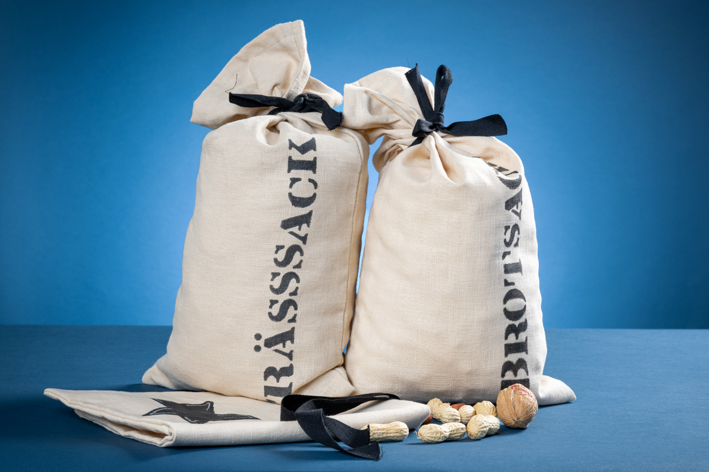 Mit gefülltem Biber und diversem Konfekt aus der Züriwerk Bäckerei sowie Erdnüssen, Baumnüssen, Fruchtbonbons, Mini-Toblerone, Mini-Kägifrets, Lindt Napolitains, Mini-Mars und Lindor-Kugeln. Im sorgfältig handgenähten und -bedruckten Leinensack, mit dem Motiv Stern oder einem Schriftzug «FRÄSSSACK» oder «BROTSACK».